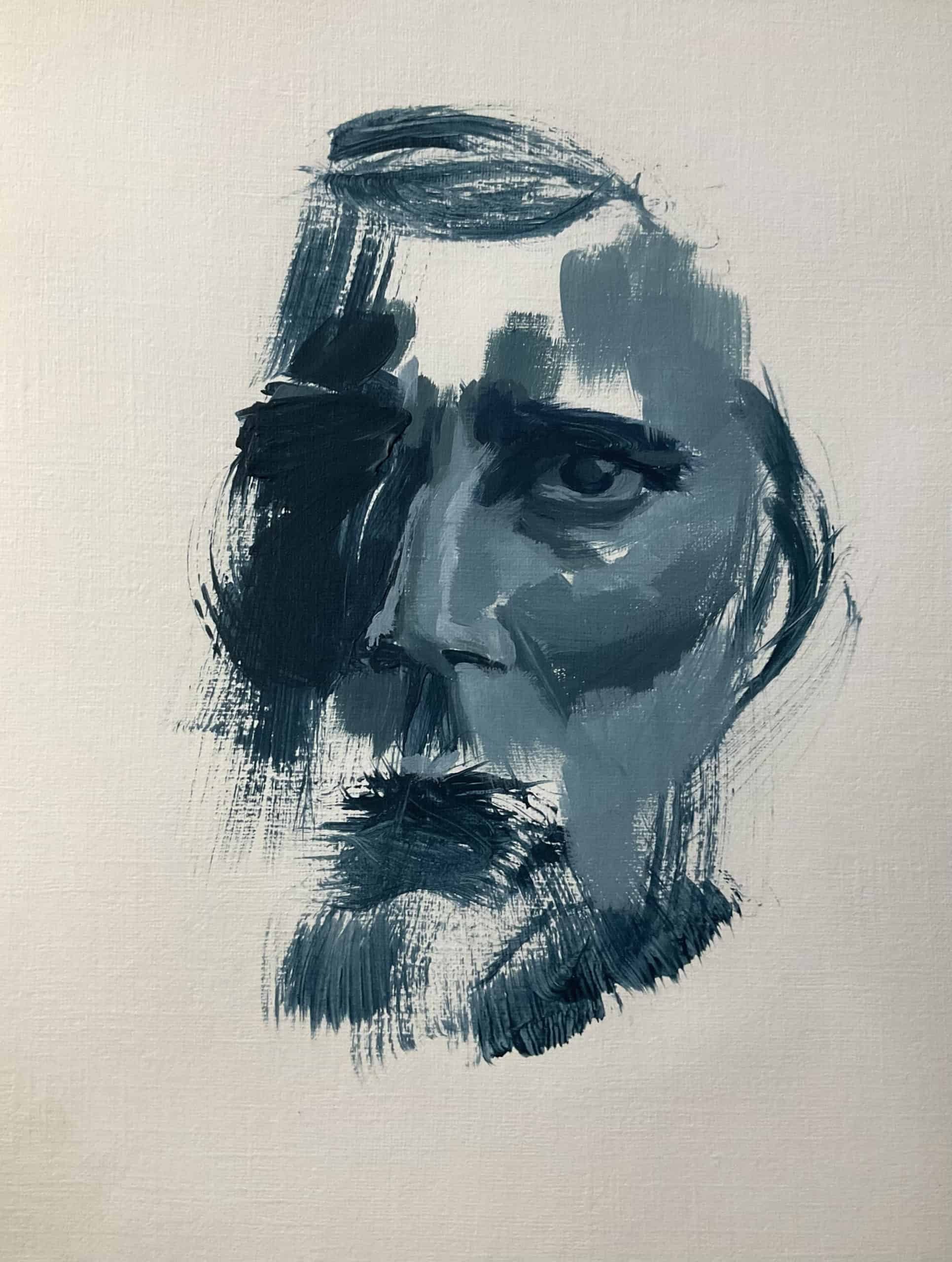 “Searching for the Blue” is a captivating series of portraits born amidst the COVID-19 pandemic, with roots in my last days in Alexandria, Virginia. Faced with leaving behind most of my art supplies, I chose to keep just three colors: ultramarine blue, titanium white, and ivory black. As I returned to Palestine, I wondered how this minimal palette would shape my art.