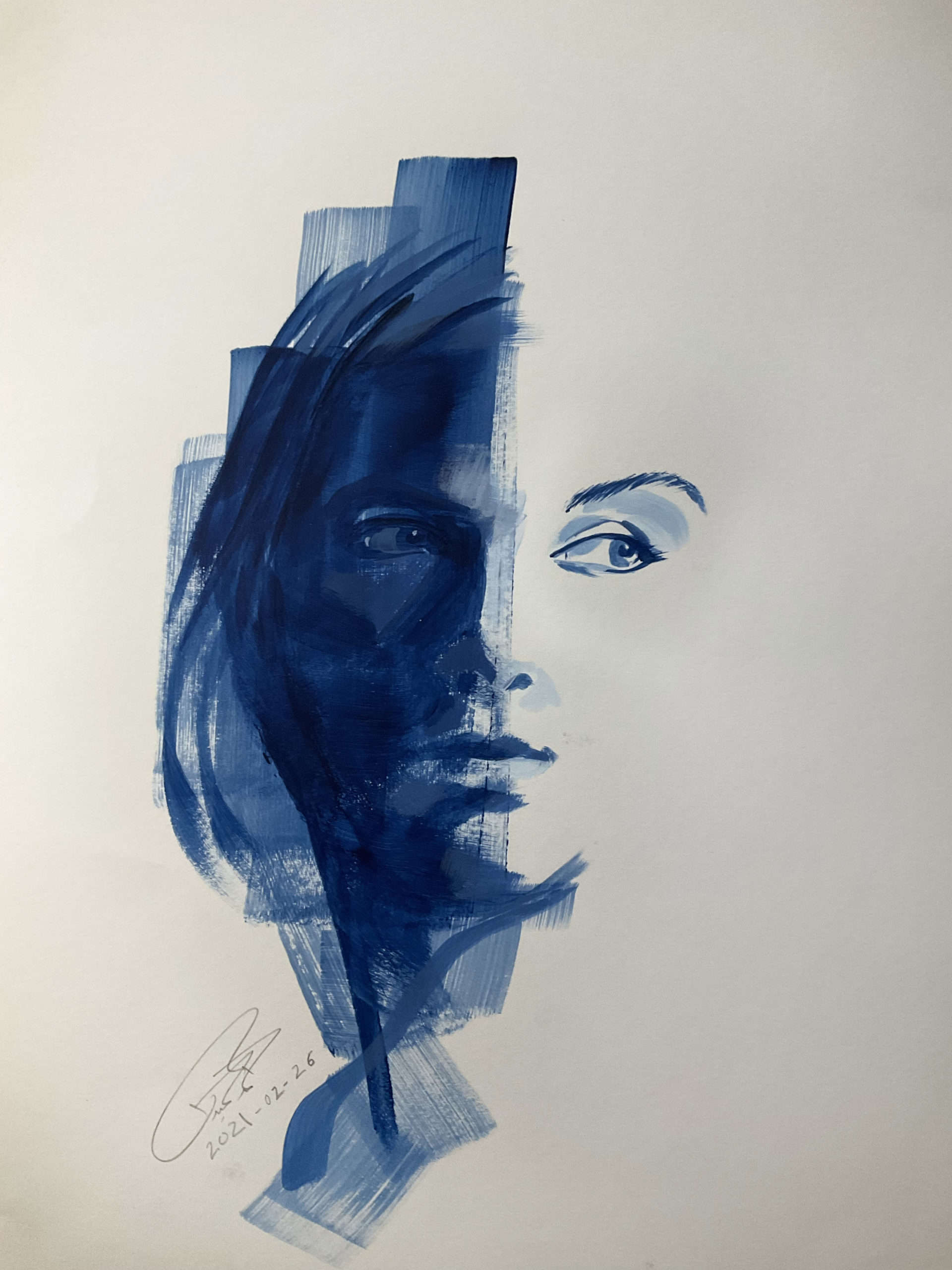 “Searching for the Blue” is a captivating series of portraits born amidst the COVID-19 pandemic, with roots in my last days in Alexandria, Virginia. Faced with leaving behind most of my art supplies, I chose to keep just three colors: ultramarine blue, titanium white, and ivory black. As I returned to Palestine, I wondered how this minimal palette would shape my art.
