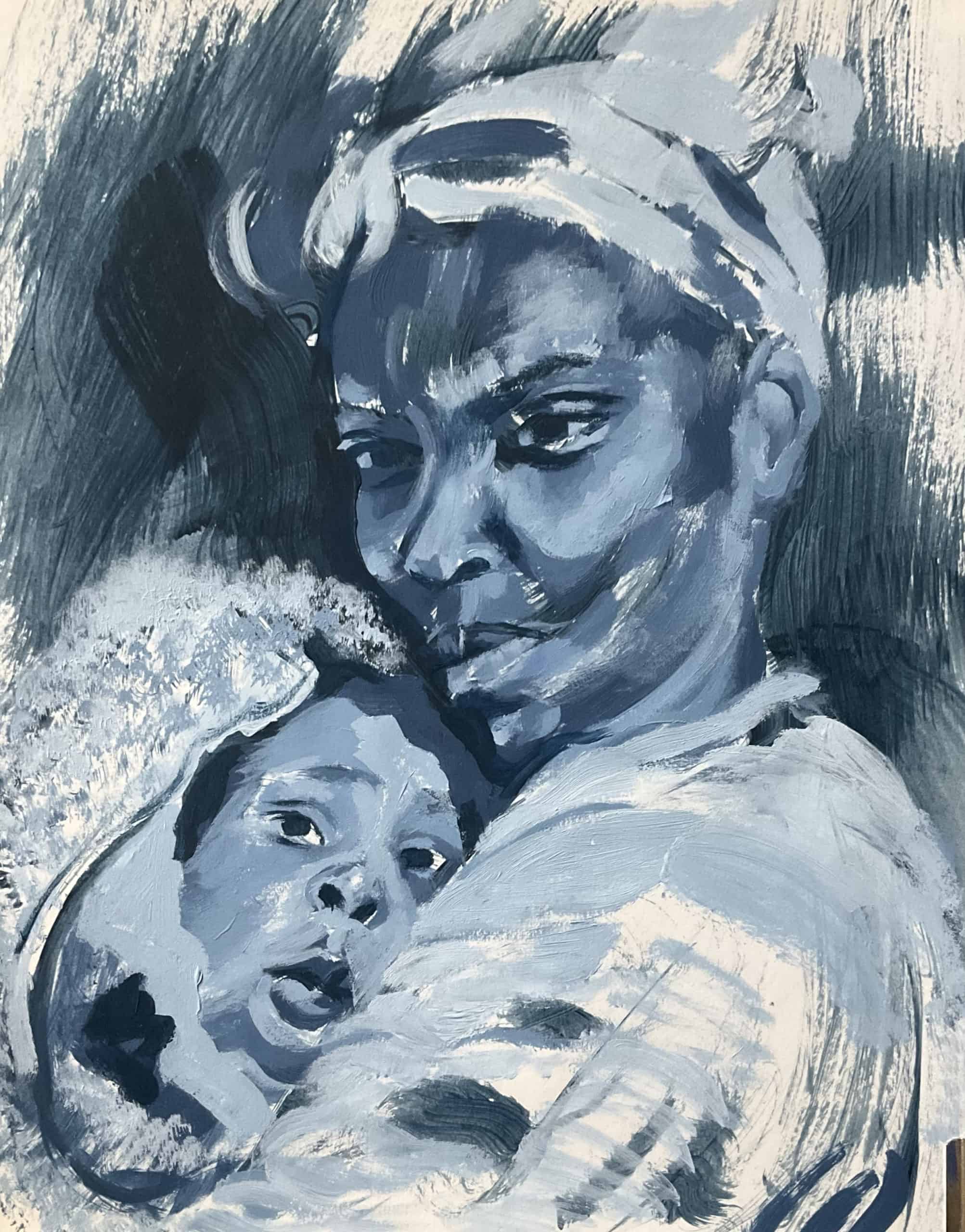“Searching for the Blue” is a captivating series of portraits born amidst the COVID-19 pandemic, with roots in my last days in Alexandria, Virginia. Faced with leaving behind most of my art supplies, I chose to keep just three colors: ultramarine blue, titanium white, and ivory black. As I returned to Palestine, I wondered how this minimal palette would shape my art.