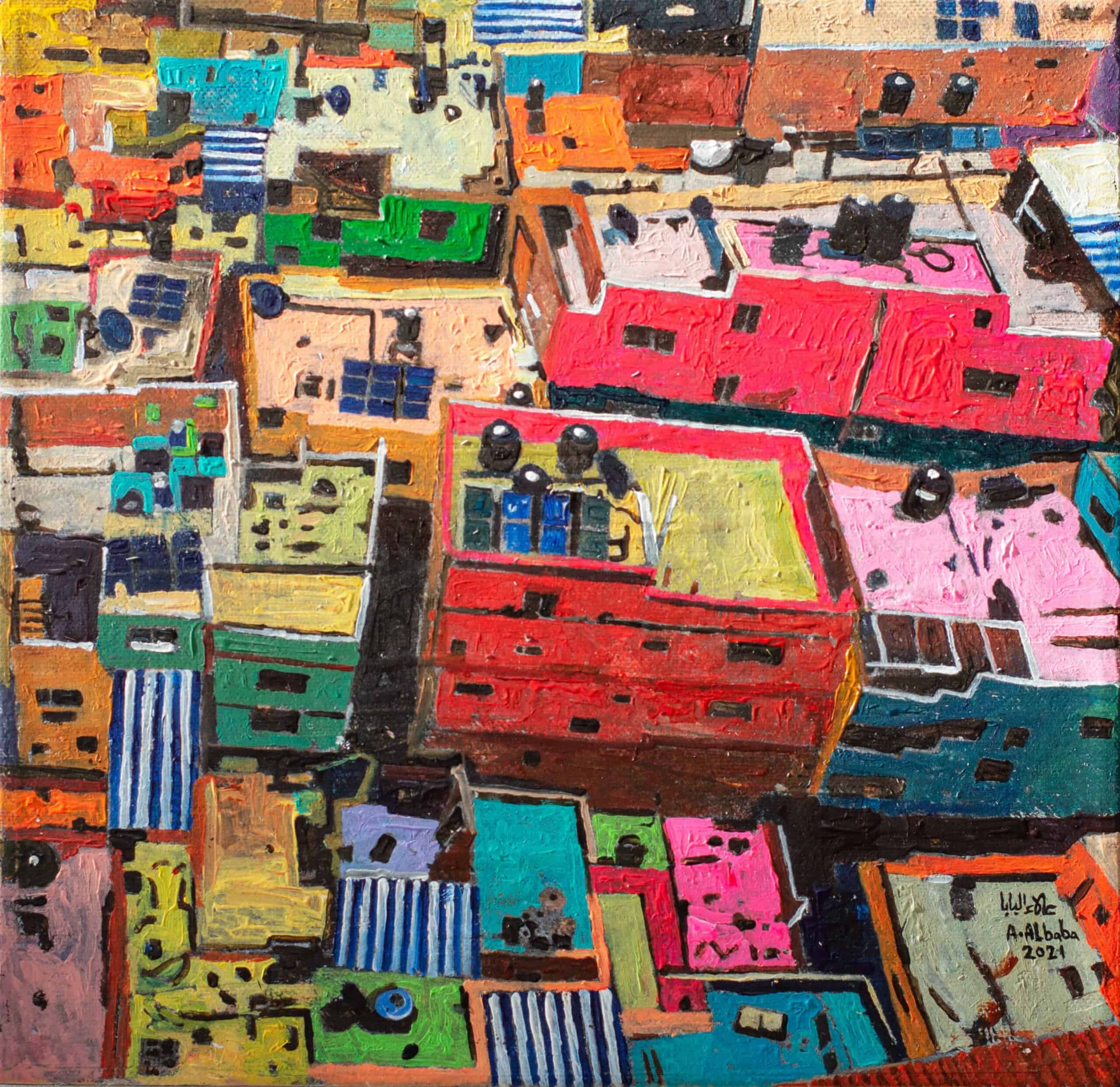 The camp’s body may seem worn out, but its vibrant alleys generate life at its edges. Hence, I chose bright shades of pink, blue, and green; because the camp, in my view, is closer to portraying its vitality, chaos, and contradictions, represented in its prevailing social system.