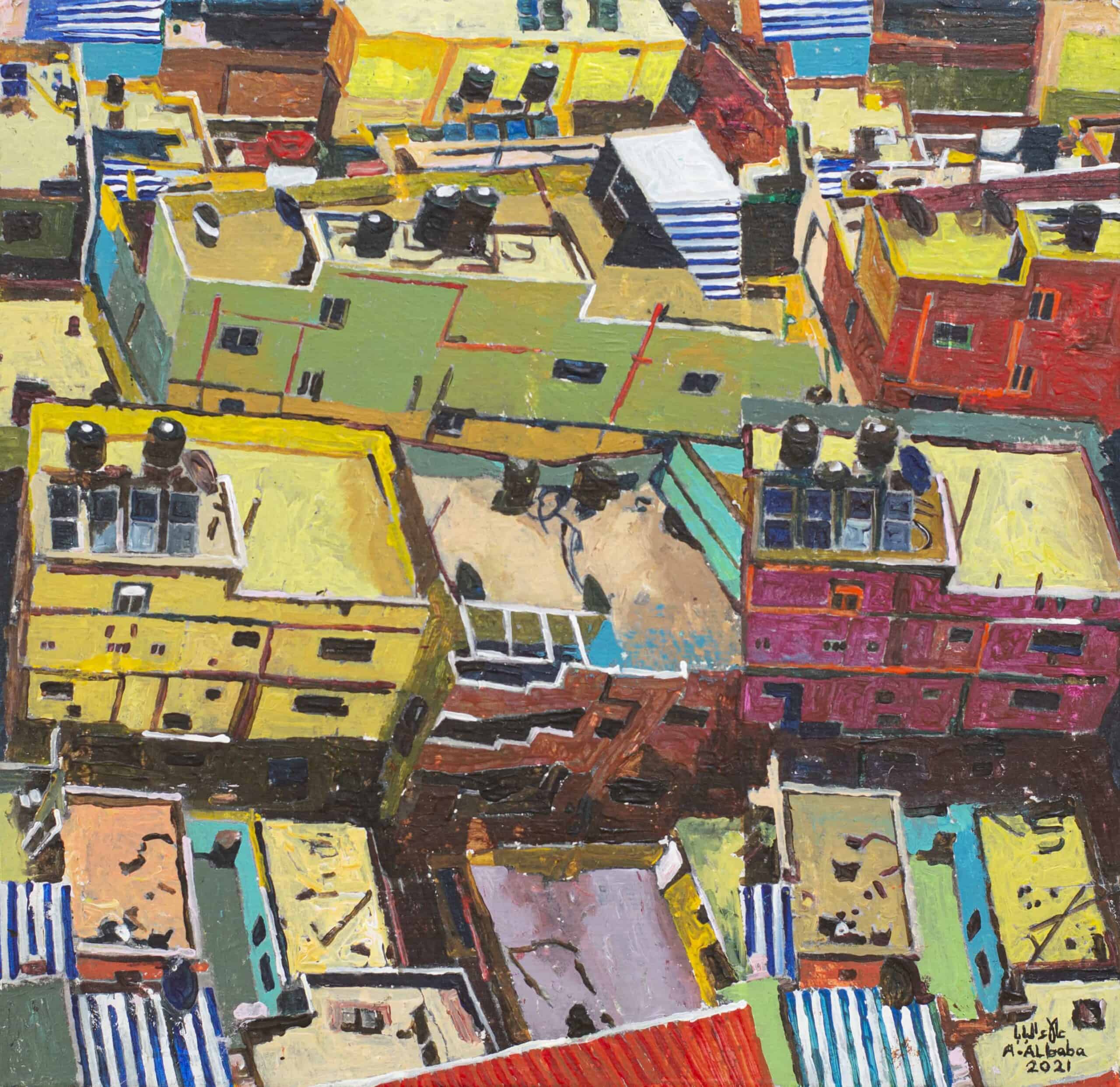 The camp’s body may seem worn out, but its vibrant alleys generate life at its edges. Hence, I chose bright shades of pink, blue, and green; because the camp, in my view, is closer to portraying its vitality, chaos, and contradictions, represented in its prevailing social system.