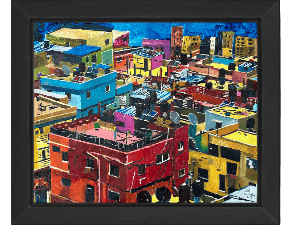 The camp’s body may seem worn out, but its vibrant alleys generate life at its edges. Hence, I chose bright shades of pink, blue, and green; because the camp, in my view, is closer to portraying its vitality, chaos, and contradictions, represented in its prevailing social system.