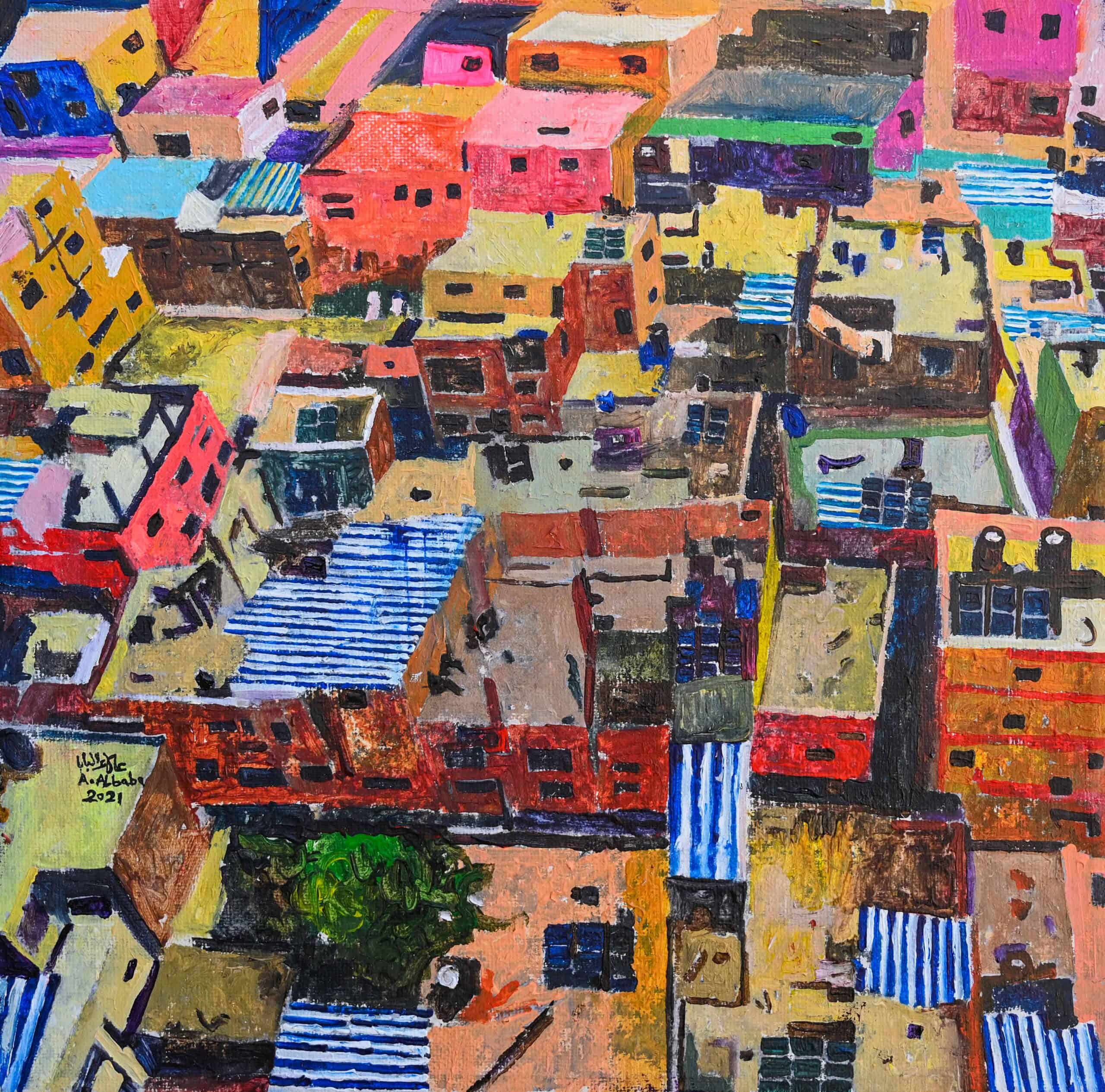 The camp’s body may seem worn out, but its vibrant alleys generate life at its edges. Hence, I chose bright shades of pink, blue, and green; because the camp, in my view, is closer to portraying its vitality, chaos, and contradictions, represented in its prevailing social system.