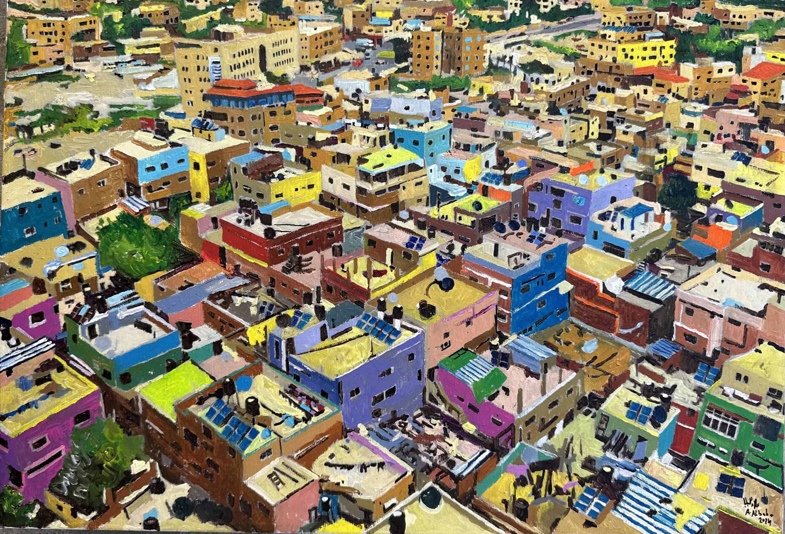 The camp’s body may seem worn out, but its vibrant alleys generate life at its edges. Hence, I chose bright shades of pink, blue, and green; because the camp, in my view, is closer to portraying its vitality, chaos, and contradictions, represented in its prevailing social system.