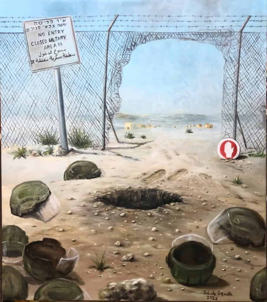 The painting symbolizes liberation from the oppression that the Palestinian people have endured due to the occupation since the Nakba to the present day. The work is inspired by the ongoing efforts of the people to break free from the imposed barriers. Despite the strict security measures, there is always a path to freedom. The time will come for the end of occupation, military rule, and barriers, allowing escape from the darkness of deprivation and finally breathing in freedom. The footprints represent the return of refugees to their lands, and the fallen helmets of the soldiers at the checkpoints symbolize the end of their oppression. Hope for liberation and freedom persists, and a vision without barriers is possible.